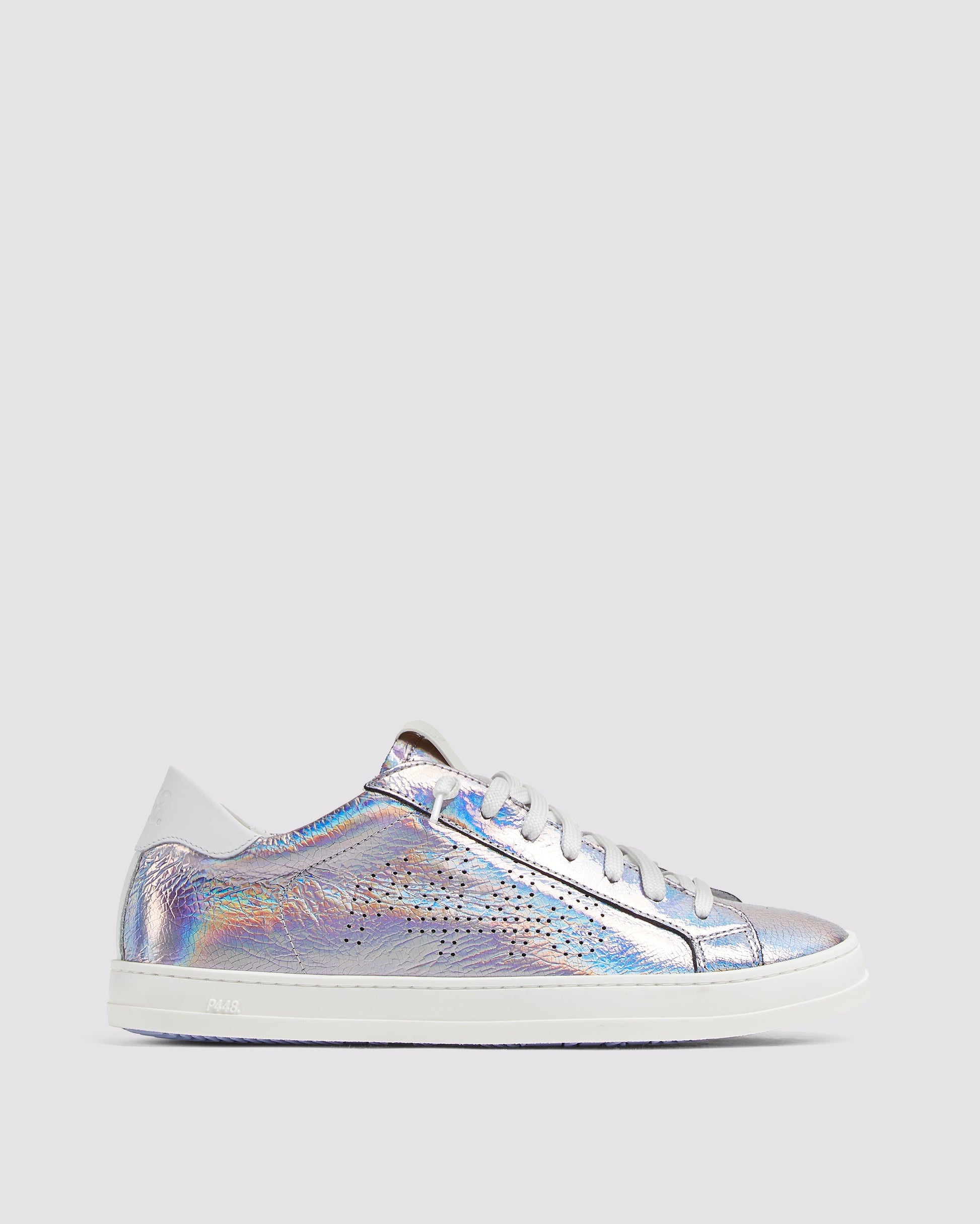 The John Opal is wrapped in holographic crackled leather grounded by a white leather heel tab, white cotton laces and signature P448 white rubber sole. The light purple tread adds a pop of color to every step.The John Opal is wrapped in holographic crackled leather grounded by a white leather heel tab, white cotton laces and signature P448 white rubber sole. The light purple tread adds a pop of color to every step.The John Opal is wrapped in holographic crackled leather grounded by a white leather heel tab, white cotton laces and signature P448 white rubber sole. The light purple tread adds a pop of color to every step.